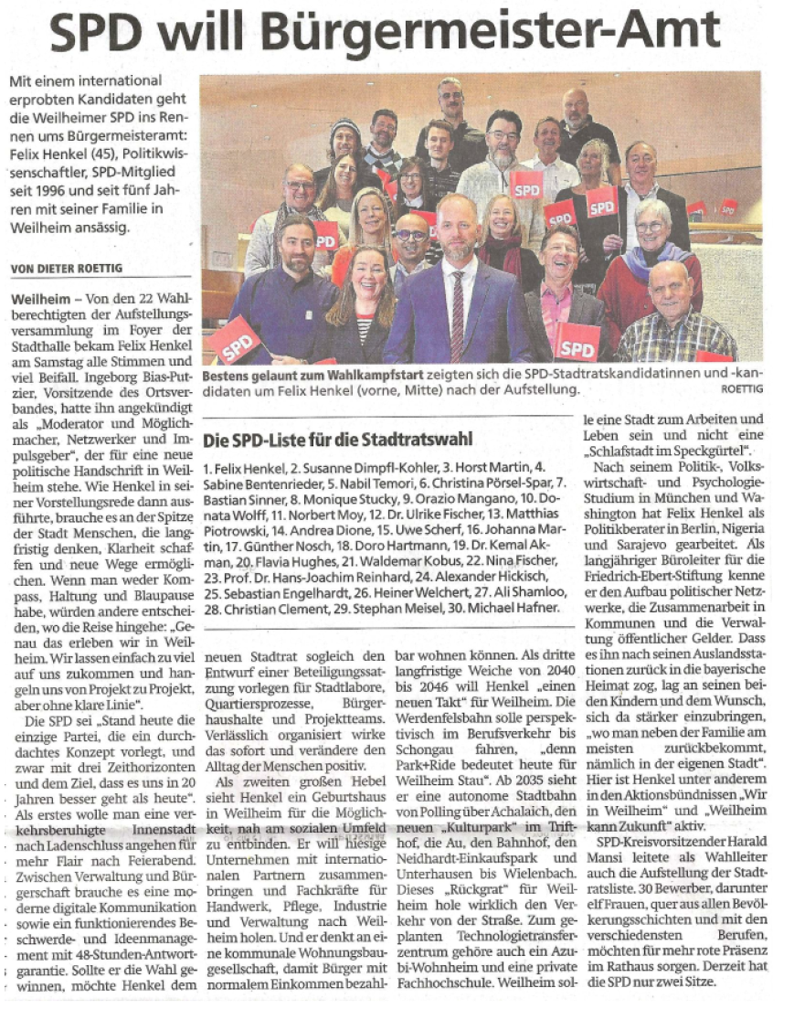 Auf ihrer Aufstellungskonferenz Ende November hat die SPD Weilheim die personellen und inhaltlichen Weichen für die Kommunalwahl 2026 gestellt. Die Mitglieder nominierten einstimmig Felix Henkel als Bürgermeisterkandidaten und verabschiedeten eine vielfältige, engagierte Liste für den Stadtrat. Die Aufstellung markiert den offiziellen Start in einen Wahlkampf, der auf Beteiligung, Klarheit und eine langfristige Perspektive für Weilheim setzt.